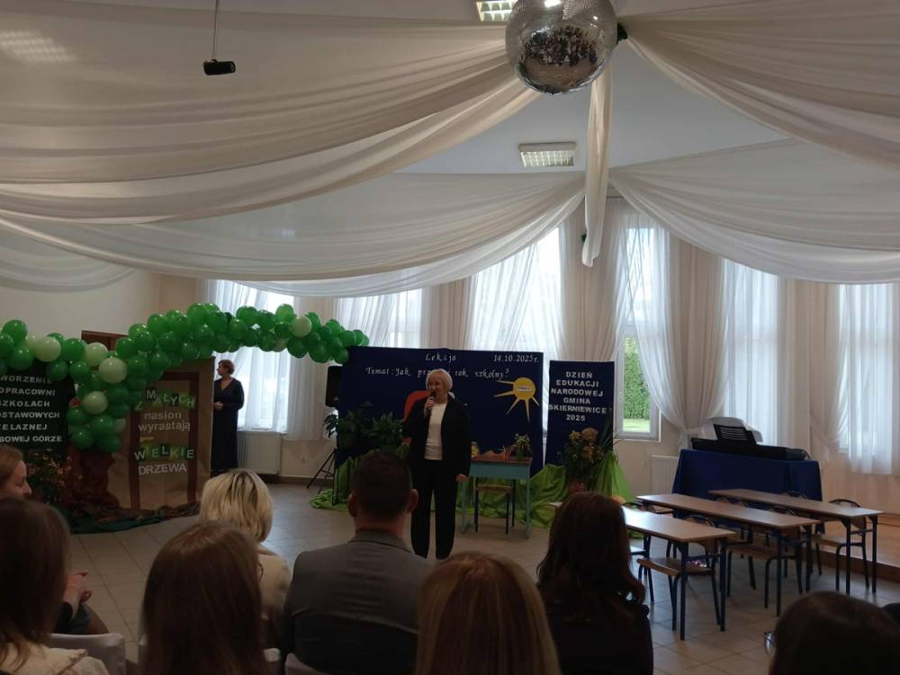 Następnie głos zabrała pani wójt Lucja Skarzyńska, która złożyła serdeczne życzenia wszystkim nauczycielom oraz pracownikom szkoły, dziękując im za trud, zaangażowanie i codzienną pracę wychowawczą.