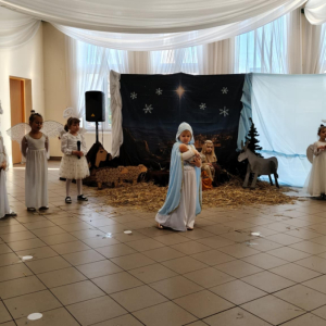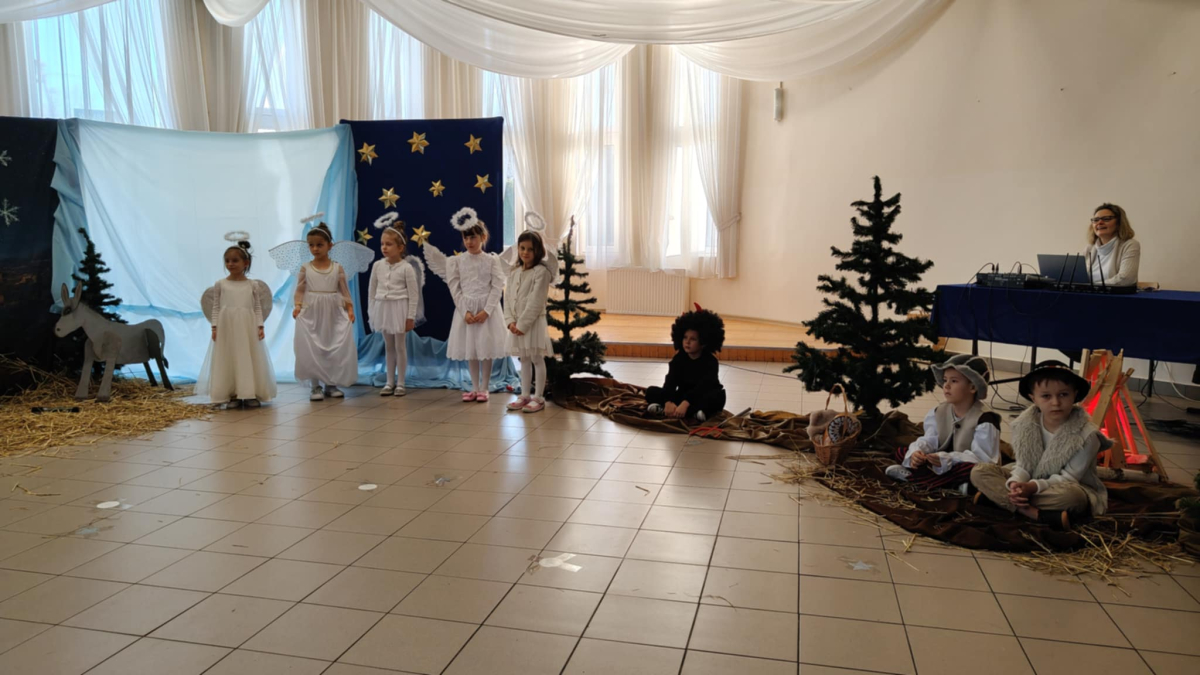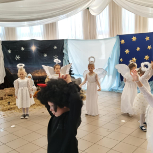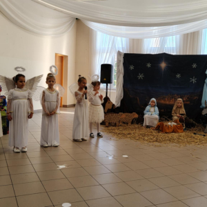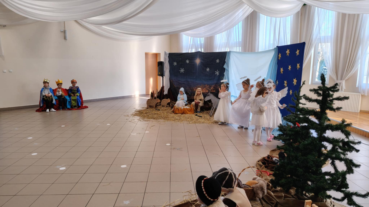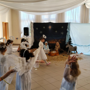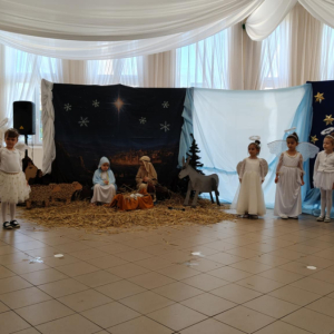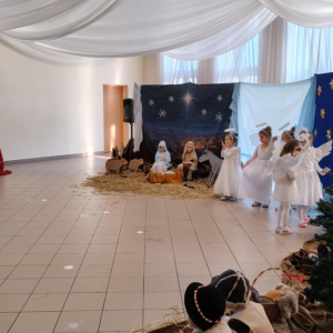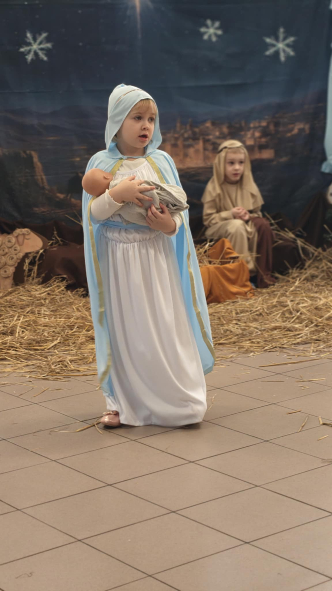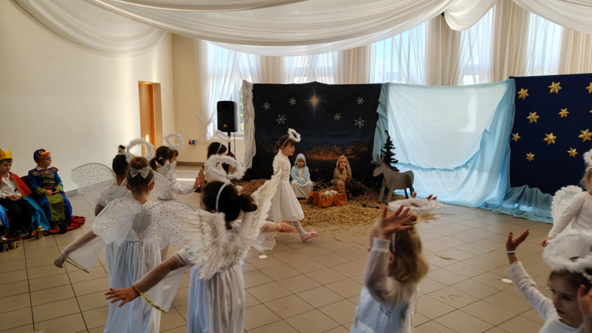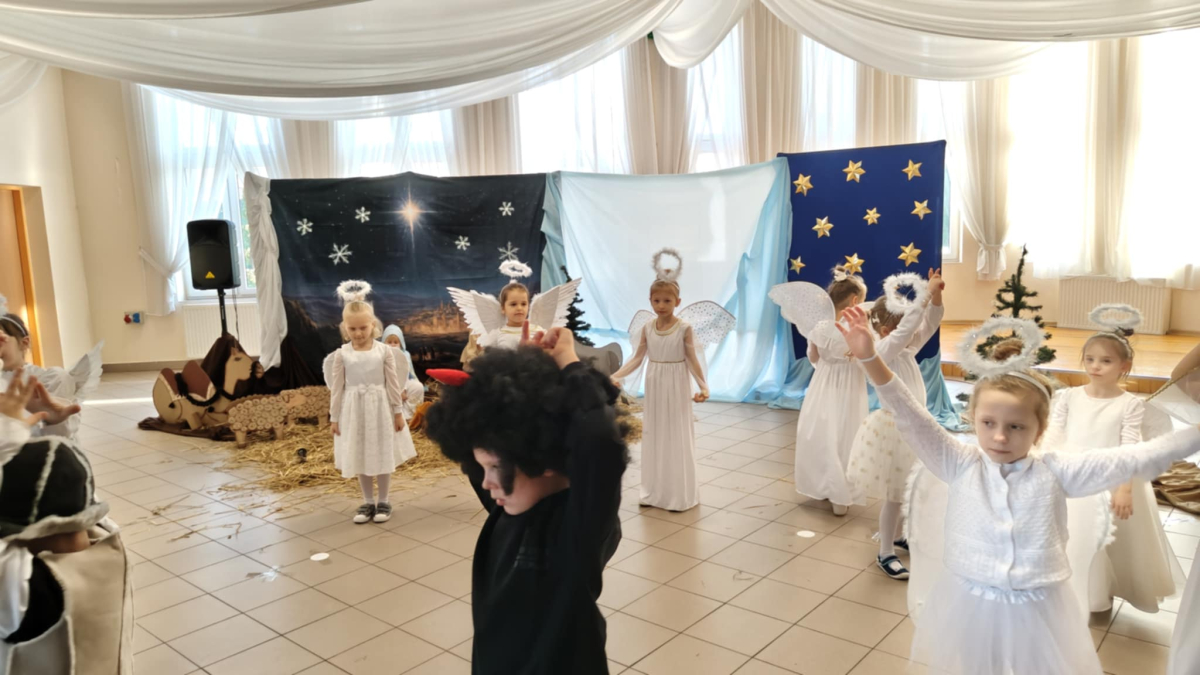 W dniu 19 grudnia 2025 roku w naszej szkole odbyła się wyjątkowa uroczystość jasełkowa, która wprowadziła wszystkich obecnych w prawdziwie świąteczny, pełen ciepła i wzruszeń nastrój. Na tle pięknie przygotowanej betlejemskiej scenografii, wśród gwiazd, aniołów i stajenki, dzieci z Oddziału Przedszkolnego z ogromnym zaangażowaniem i radością zaprezentowały historię narodzin Jezusa. Mali artyści, wcielając się w role aniołów, Maryi, Józefa oraz pozostałych postaci, zachwycili publiczność swoją naturalnością, odwagą i szczerością. Każde słowo, gest i uśmiech przypominały o tym, co w Świętach Bożego Narodzenia jest najważniejsze – miłość, pokój, bliskość i nadzieja. Szczególne podziękowania kierujemy do Rodziców za wsparcie i obecność.