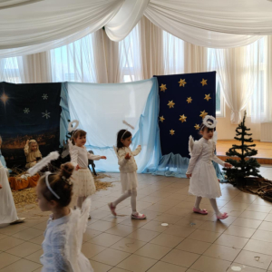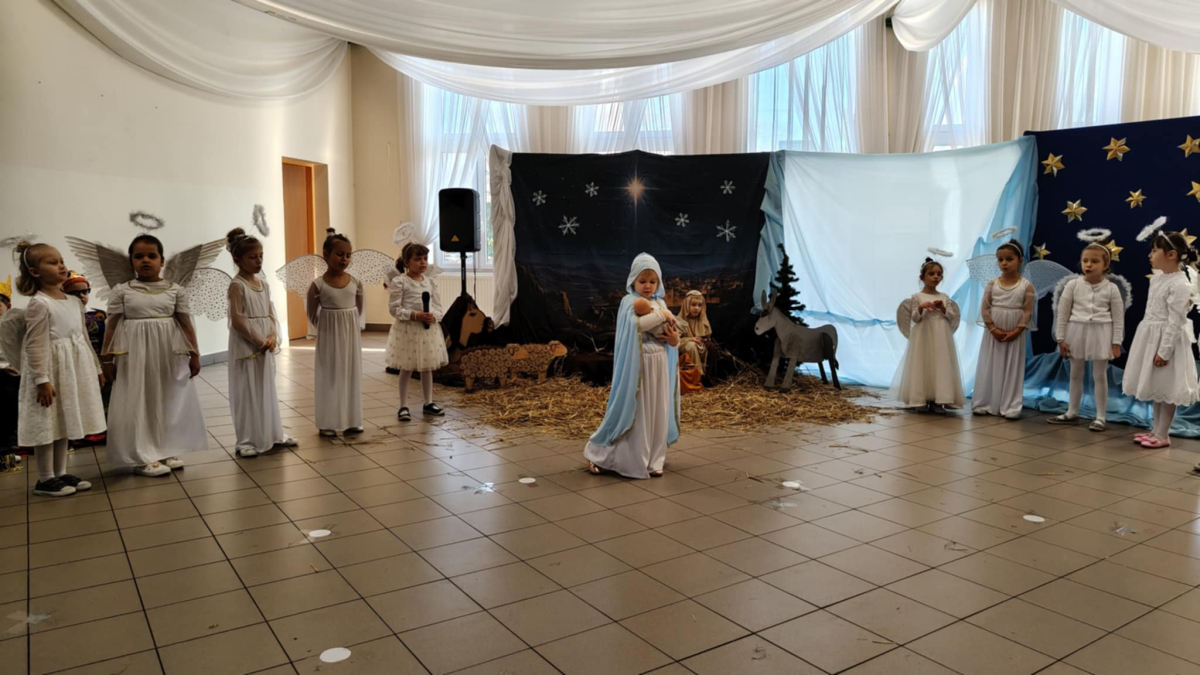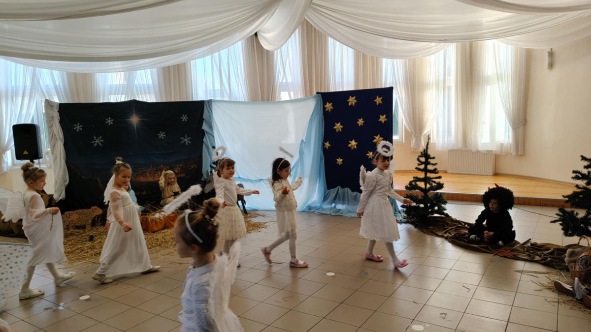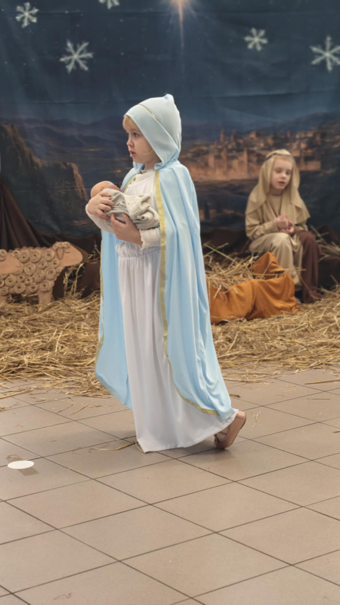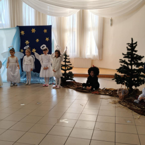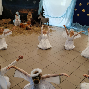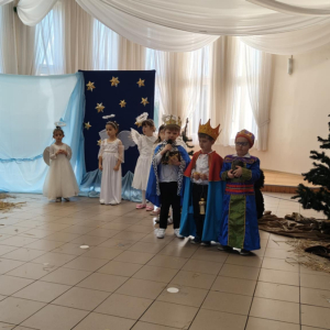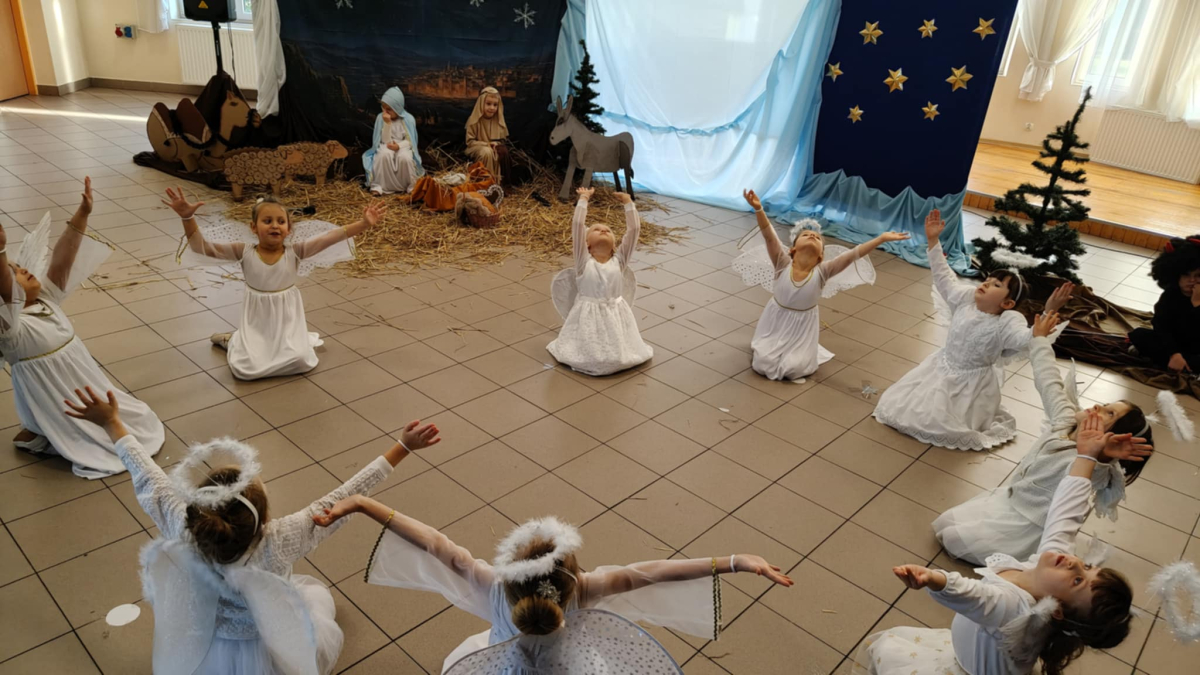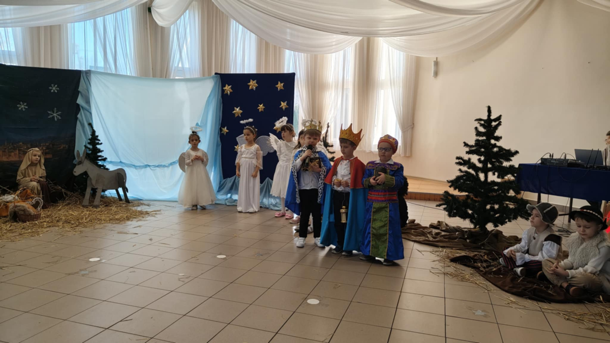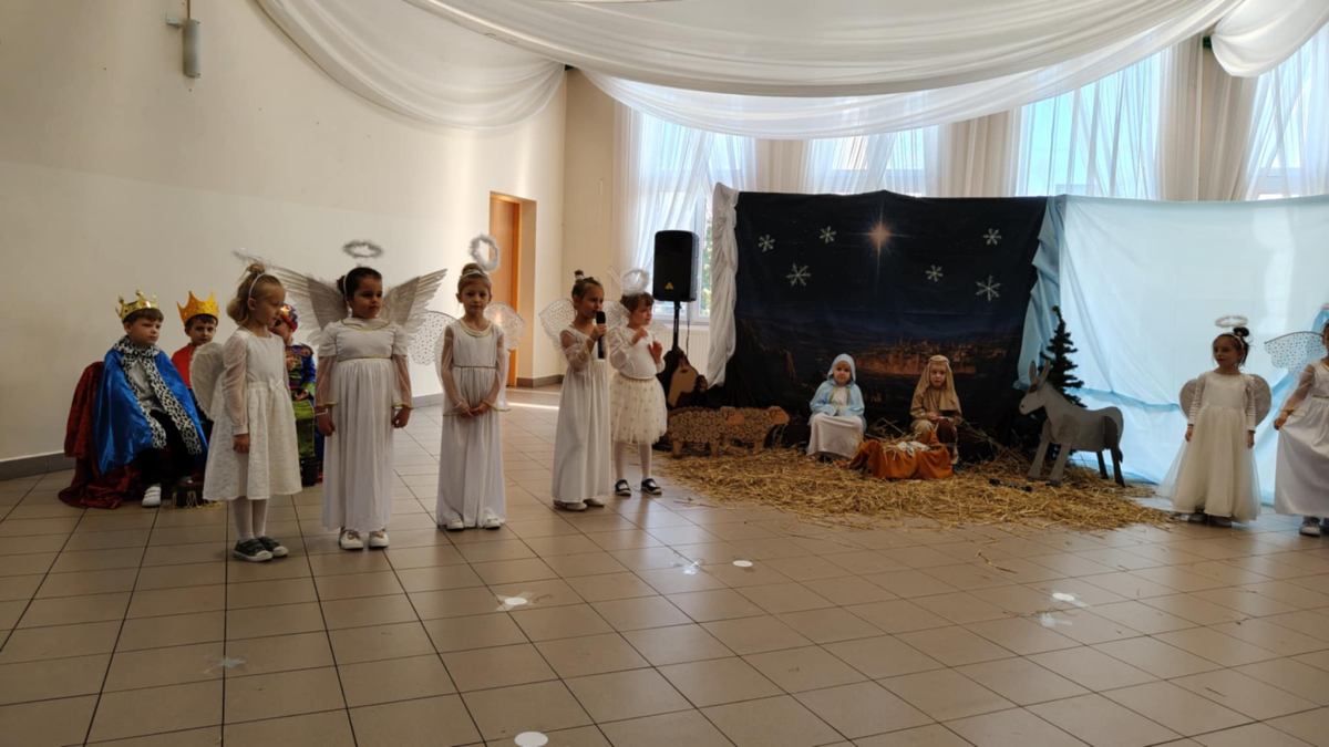 W dniu 19 grudnia 2025 roku w naszej szkole odbyła się wyjątkowa uroczystość jasełkowa, która wprowadziła wszystkich obecnych w prawdziwie świąteczny, pełen ciepła i wzruszeń nastrój. Na tle pięknie przygotowanej betlejemskiej scenografii, wśród gwiazd, aniołów i stajenki, dzieci z Oddziału Przedszkolnego z ogromnym zaangażowaniem i radością zaprezentowały historię narodzin Jezusa. Mali artyści, wcielając się w role aniołów, Maryi, Józefa oraz pozostałych postaci, zachwycili publiczność swoją naturalnością, odwagą i szczerością. Każde słowo, gest i uśmiech przypominały o tym, co w Świętach Bożego Narodzenia jest najważniejsze – miłość, pokój, bliskość i nadzieja. Szczególne podziękowania kierujemy do Rodziców za wsparcie i obecność.